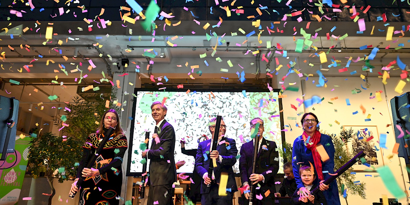 Mit einem Konfettiregen eröffneten die Initator:innen im Gasteig HP8 das Flower Power Festival. In den kommenden acht Monaten wird die Natur gefeiert in ganz München und Umgebung mit mehr als 600 Veranstaltungen und mehr als 200 Beteiligten.